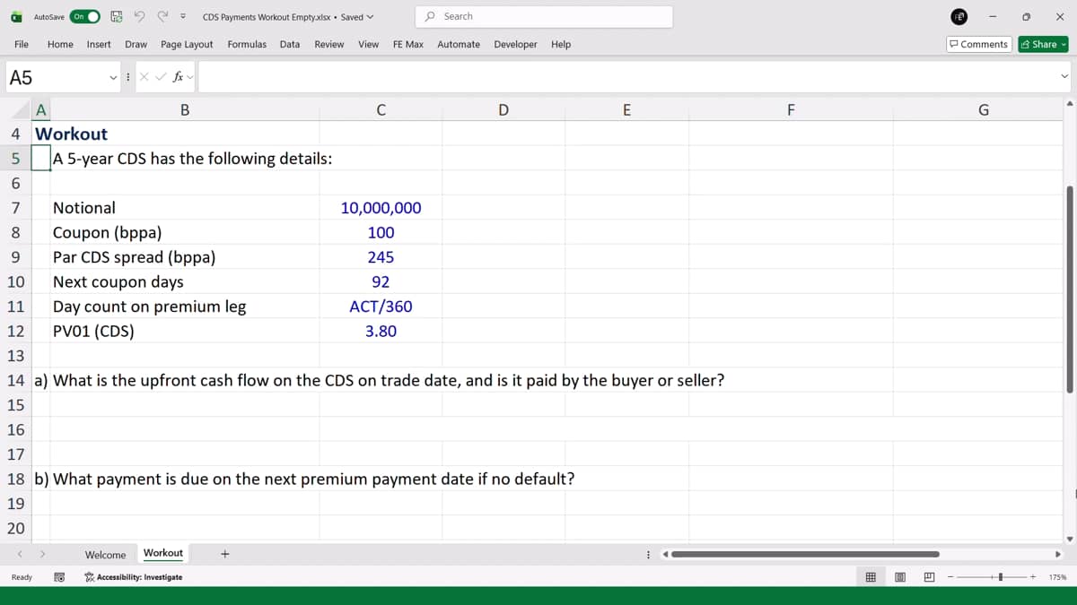 In this workout, we are given a five year CDS with the following details.