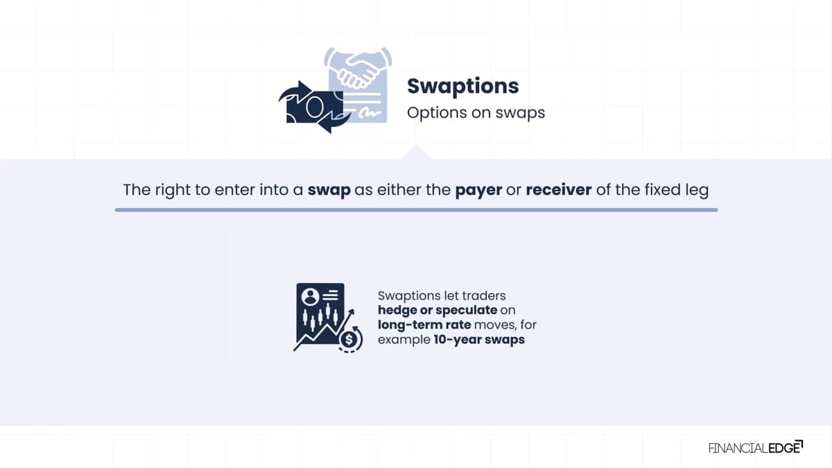 Swaptions, as the name suggests, are options on swaps, specifically the right to enter into a swap as either the payer or receiver of the fixed leg.