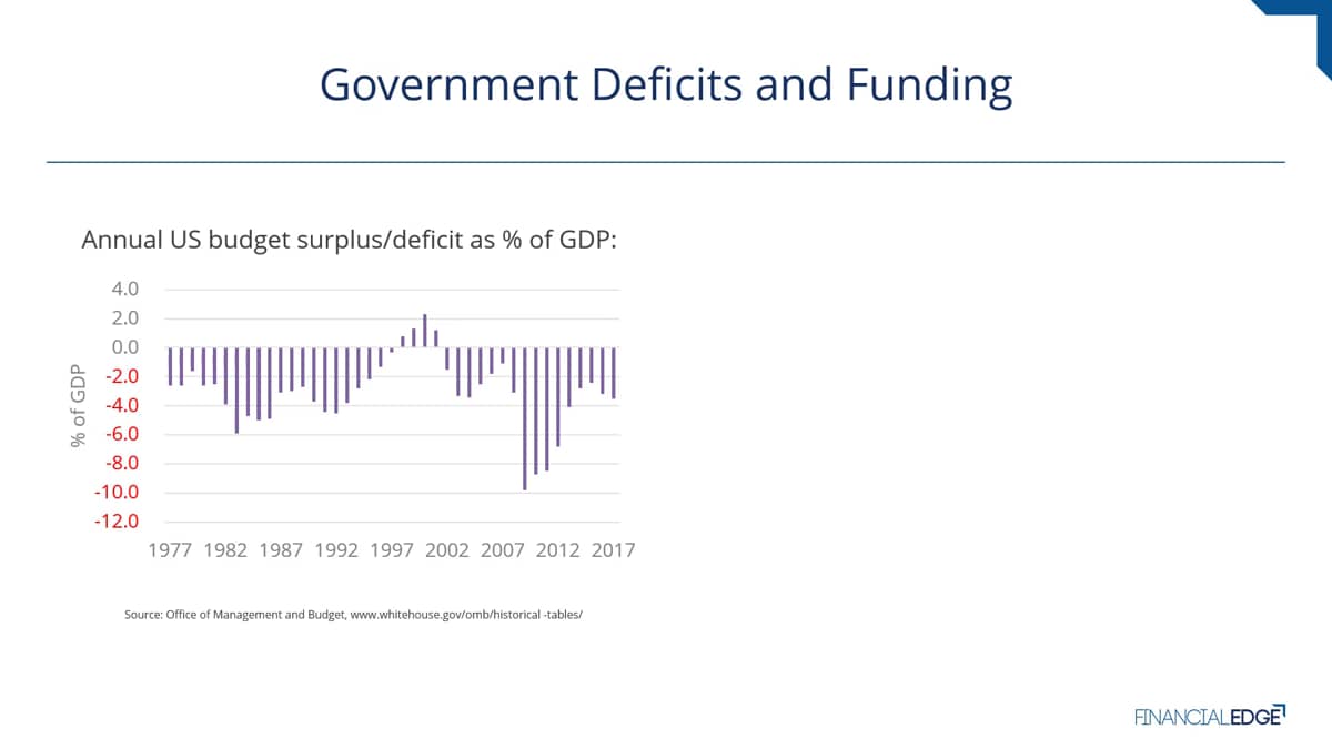 A key feature of a bond is the issuer as this determines the credit risk the investor is exposed to. In case of government bonds, also referred to as Govies, the issuer is a sovereign government. Govies are purchased by a broad range of investors, the institutional investors like pension funds, asset managers, and the like, banks, non-financial corporations, and by individuals as well. As a taxpayer though, you might wonder why governments need to borrow money at all. And you're right. The majority of the government's expenditures should be funded by government revenues like for example, income tax, corporate taxes, et cetera. However, in reality, the government expenses, for example, payments to develop and maintain infrastructure, pensions, et cetera, often exceed the government revenues. And the government then is said to run a budget deficit. In the rare cases where revenues exceed the expenses, the government is said to run a budget surplus. As an example, the graph here shows the annual budget surplus. These are the positive values and deficits of the US government as a percentage of the US gross domestic product, or GDP, from 1977 until 2017. As you can see, in most years over this time series, the US government ran a deficit, which would've been debt financed, and consequently, the amount of US federal debt held by the public, shown on the chart here, has pretty much constantly increased over time. Large proportions of these deficits are financed by the issuance of government bonds. So this chart also gives you a good indication about the significance of global government bond markets. Because government bond markets are so sizable, Govies are usually traded quite frequently, which means that government bonds are a very liquid product. It is relatively simple and cheap to trade in and out of government bond positions, which of course is a major advantage of this type of investment. But there are more advantages. And probably the most important one besides liquidity is the aspect that Govies, at least if issued by large developed economies, have very little credit risk. In fact, government bonds of these countries are often referred to as being credit risk-free, as it is assumed that due to the government's ability to increase the amount of tax collected and the potential backstop function of the country central bank, there is not going to be a default in these bonds. Closely linked to credit risk is a benefit that Govies generate a stable income stream. While all fixed coupon bonds have a fixed payment schedule by nature, only in the absence of credit risk these cash flows can be taken as guaranteed. So for investors that need a guaranteed income stream, government bonds play an important role in their investment portfolio. Individual investors will also have very different investment horizons, but as governments generally issue bonds of certain standard maturities on a very regular basis, a wide range of maturities is available for investors in the secondary market. So investors will most likely be able to find a government bond with a maturity close to the investment horizon. As mentioned, government bonds are usually the investment with the lowest credit risk in a particular country. And so consequently, government bond yields become the benchmark for all other bond investments in this country. As all other issuers, for example, from the corporate sector, will have a higher risk of default, investors will demand a premium above the government bond yield as compensation. And this premium is commonly referred to as the credit spread.
